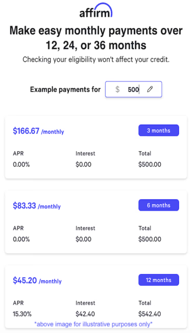 For example, a $2,000 purchase might cost $69.57/mo. over 36 months at 15% APR.